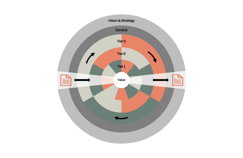 How can companies make this transformative shift in managing documents? Simply buying new software or scanning everything to the cloud won’t automatically solve the problem. What’s needed is a strategic framework that aligns people, process, and technology – and this is exactly what the DVM model provides. Document Value Management (DVM) is a methodology developed by Upper Spire (the company behind Cartularius) to guide organizations step by step from document chaos to clarity. Think of DVM as a blueprint and toolkit for document transformation. It’s a strategic consulting approach (not tied to any single software platform) that starts with governance and process design before recommending technology. Whether your files live in Salesforce, SharePoint, network drives or paper archives, the DVM principles apply universally – focusing on strategy first, technology second.